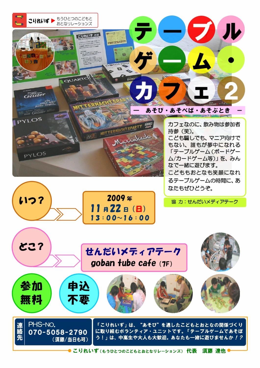 次のチラシは、「青葉縁日」も終わり、純粋に「goban tube cafe」の企画として動きだした「テーブルゲーム・カフェ2(2009.11.22開催)」のチラシデータ。